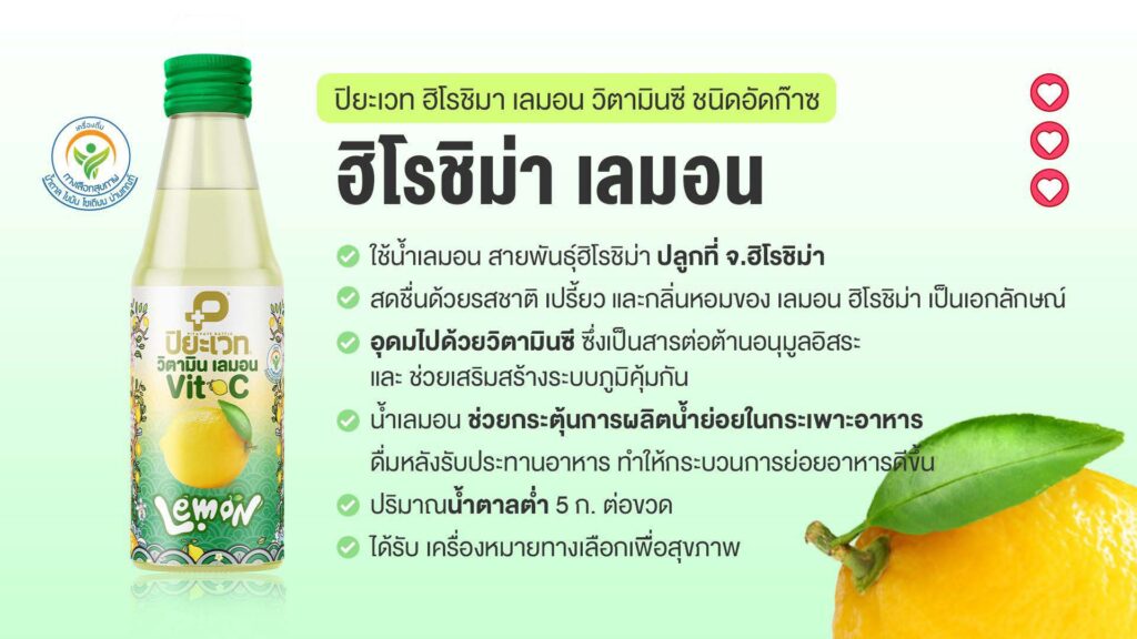 น้ำเลมอนฮิโรช่า วิตามินซี (ชนิดอัดก๊าซ) คือหนึ่งในผลิตภัณฑ์นวัตกรรมเพื่อสุขภาพ จากโรงพยาบาลปิยะเวท ที่คัดสรรวัตถุดิบคุณภาพสูงอย่าง “ฮิโรชิม่า เลมอน” ซึ่งปลูกในจังหวัด ฮิโรชิม่า ประเทศญี่ปุ่น